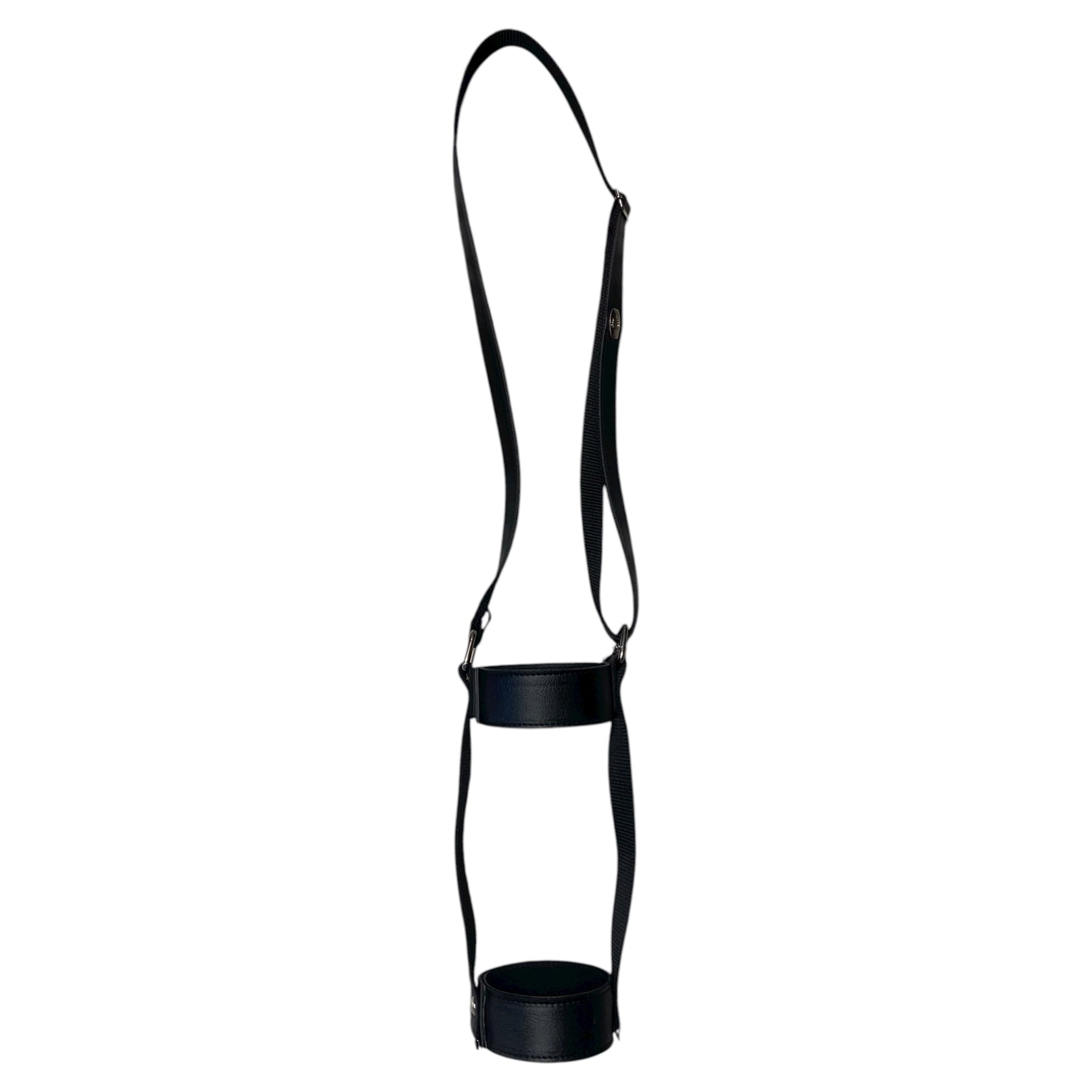 La struttura è composta da due anelli che sostengono la bottiglia alla base e al corpo, garantendo stabilità e protezione durante il trasporto. La bretella regolabile consente di indossarla a spalla o crossbody, adattandosi a ogni altezza e situazione, lasciando le mani libere.