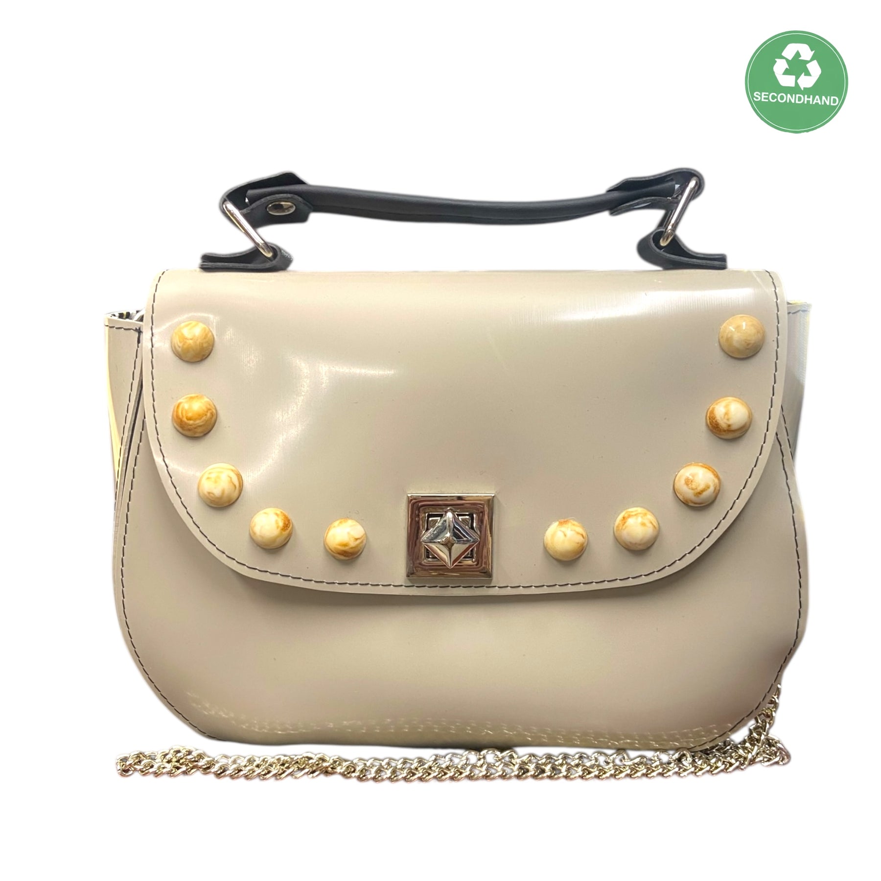 Realizzata in PVC beige, si distingue per il suo design pulito e raffinato, arricchito da una chiusura a girello rettangolare in metallo e da sfere decorative in resina marmorizzata color crema sulla pattina, che donano un tocco elegante e originale.