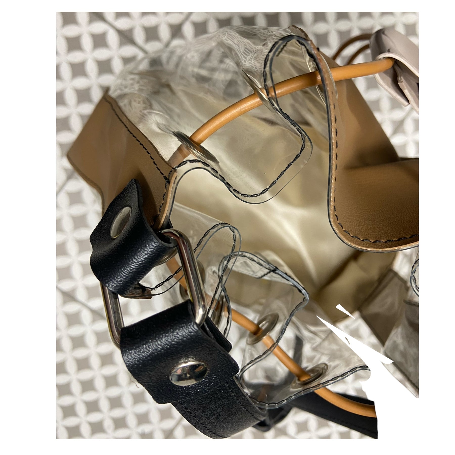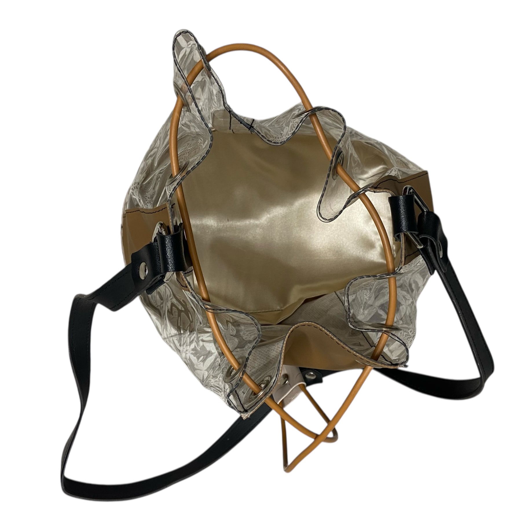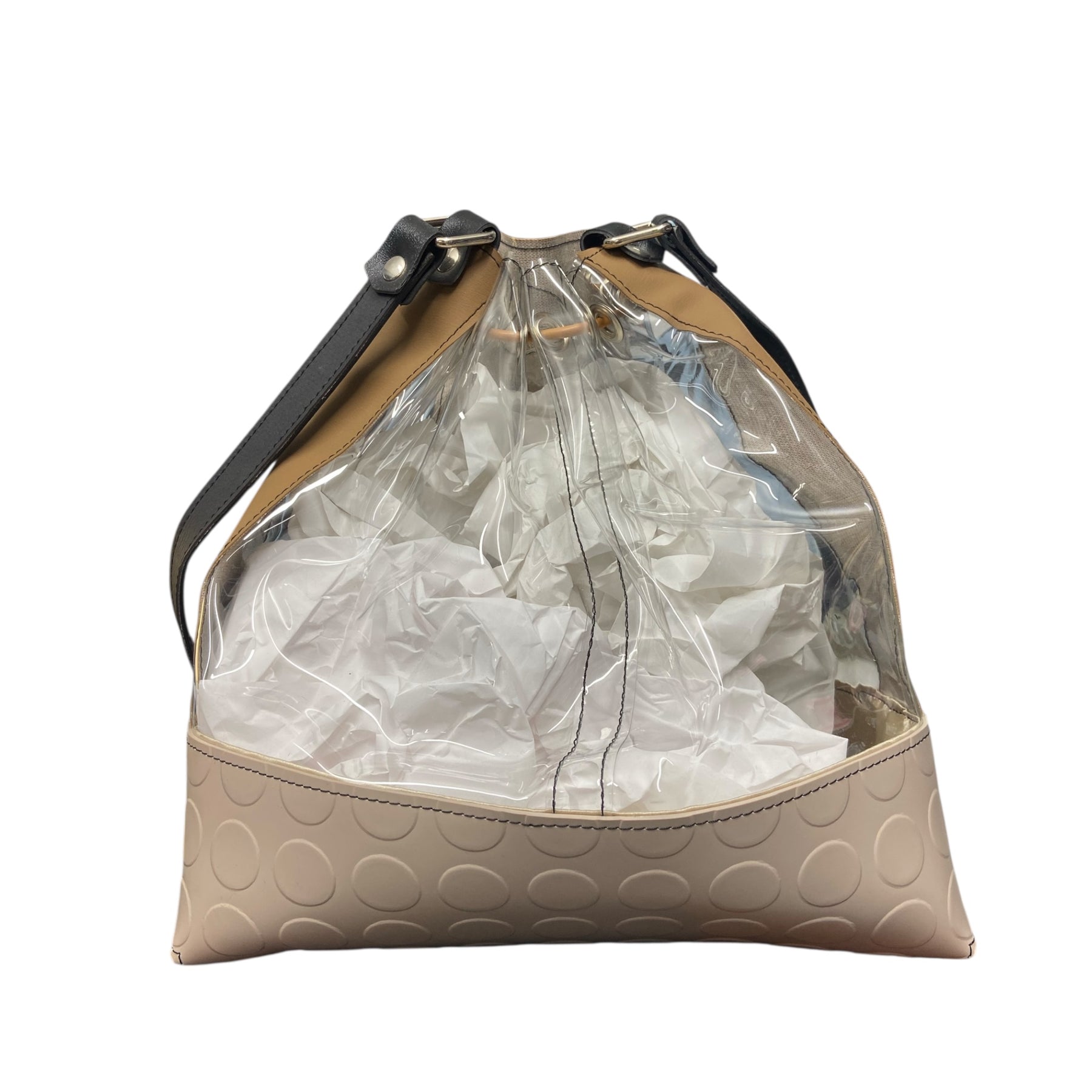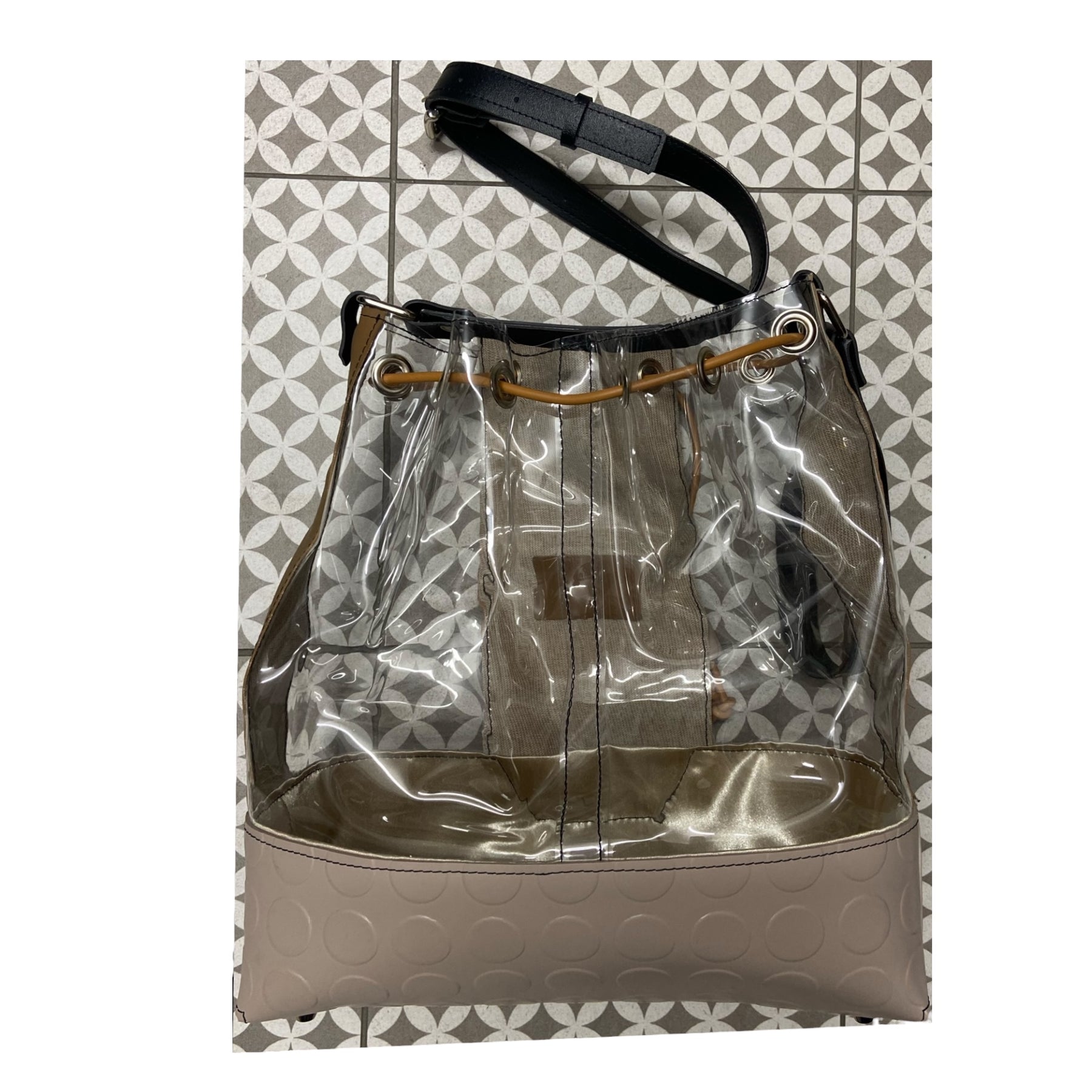 La scocca sagomata in PVC color sabbia crea una base strutturata e resistente, mentre le fasce trasparenti laterali rendono la borsa leggera alla vista e originale.