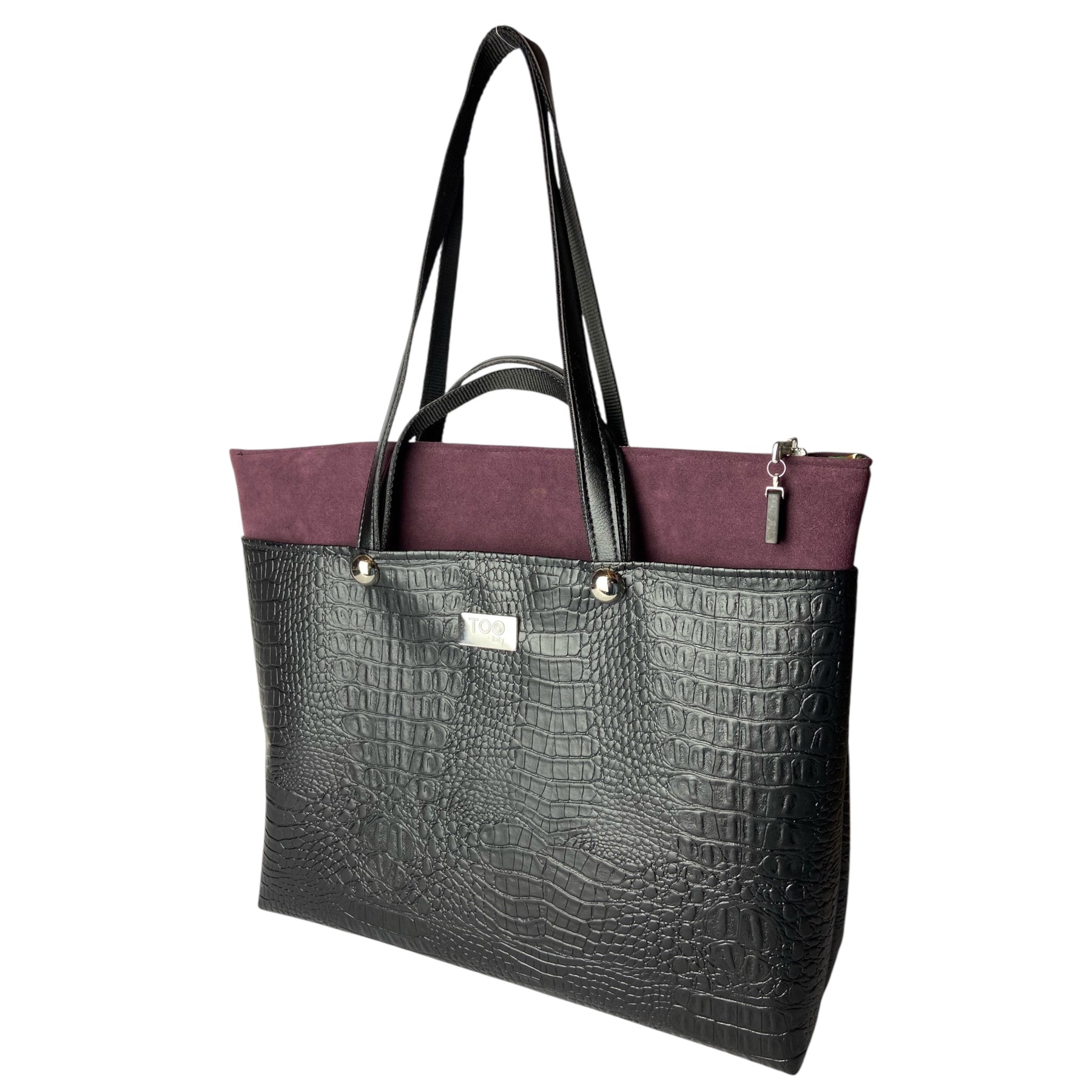 Realizzata in pelle vegan con stampa cocco nera e fascia superiore in alcantara bordeaux