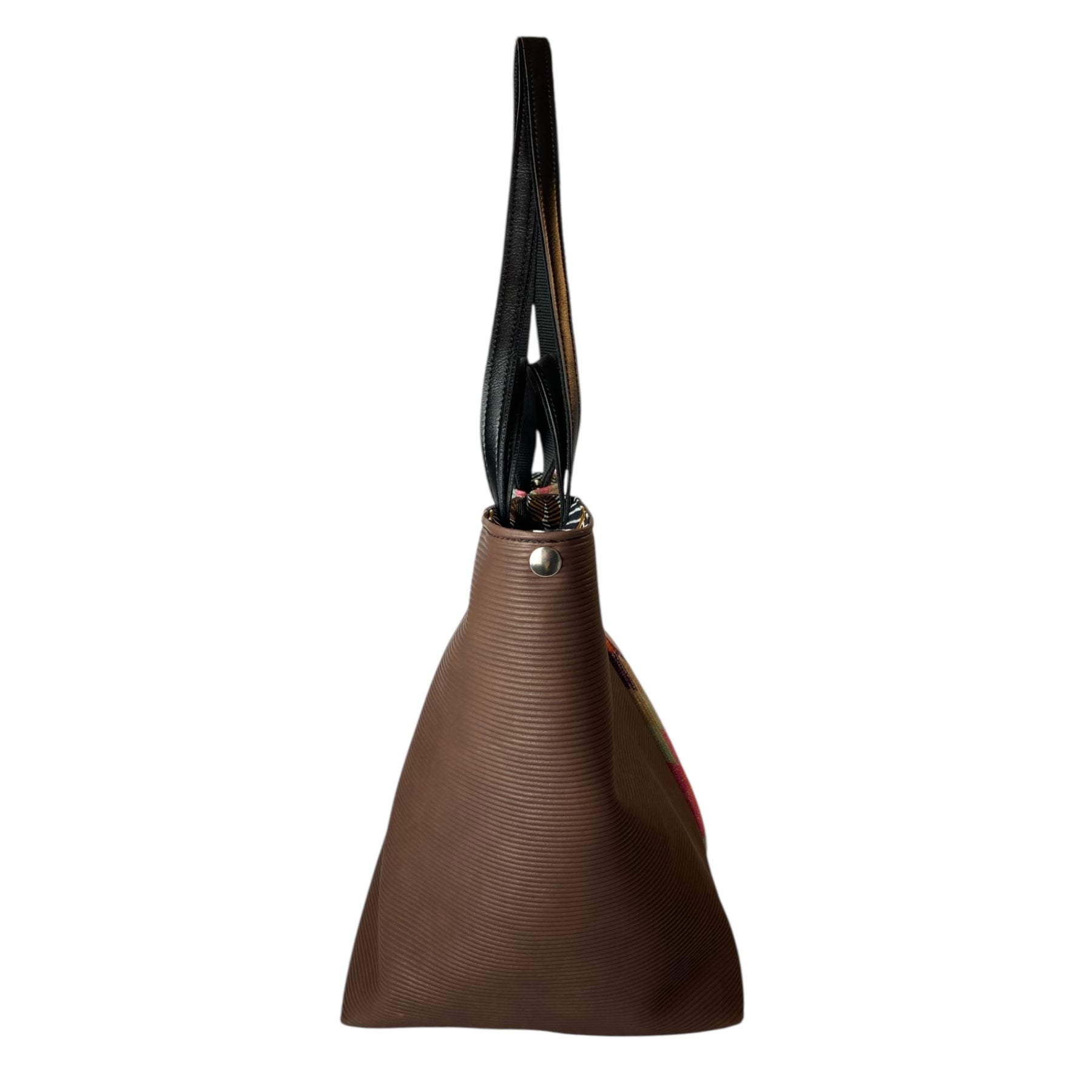 🎨 Dettagli curati: realizzata in tessuti di alta tappezzeria 100% circolari: lato in fantasia geometrica multicolor e lato in pelle vegan marrone; interno foderato in cotone wax 100%, con tasca interna; etichetta stampata a caldo su pelle vegan