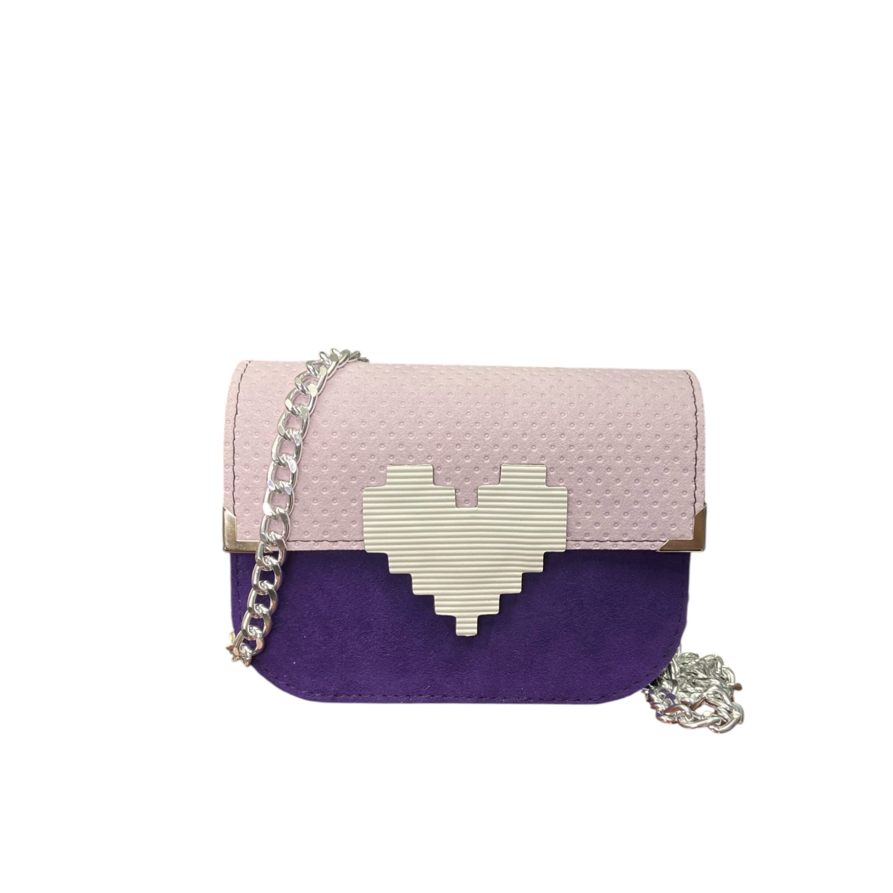 Elegante, creativa, distintiva, Chicca Mini Viola Iris interpreta il design TOOitaly attraverso una combinazione cromatica sofisticata e un cuore pixel iconico, trasformando un accessorio compatto in un vero elemento di identità.