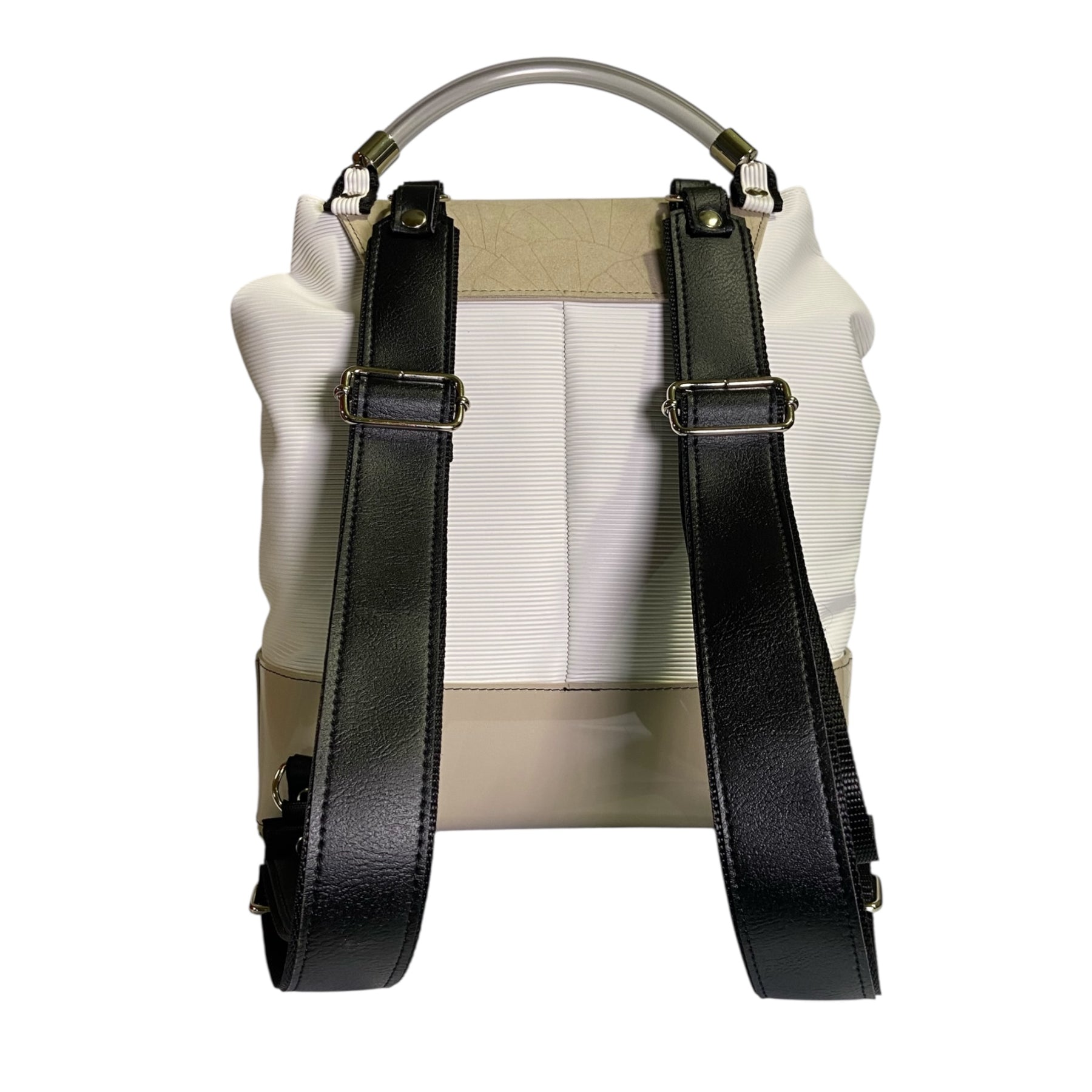 Il manico tubolare trasparente crea un dettaglio moderno e originale, rendendo lo zaino versatile anche come borsa da portare a mano.