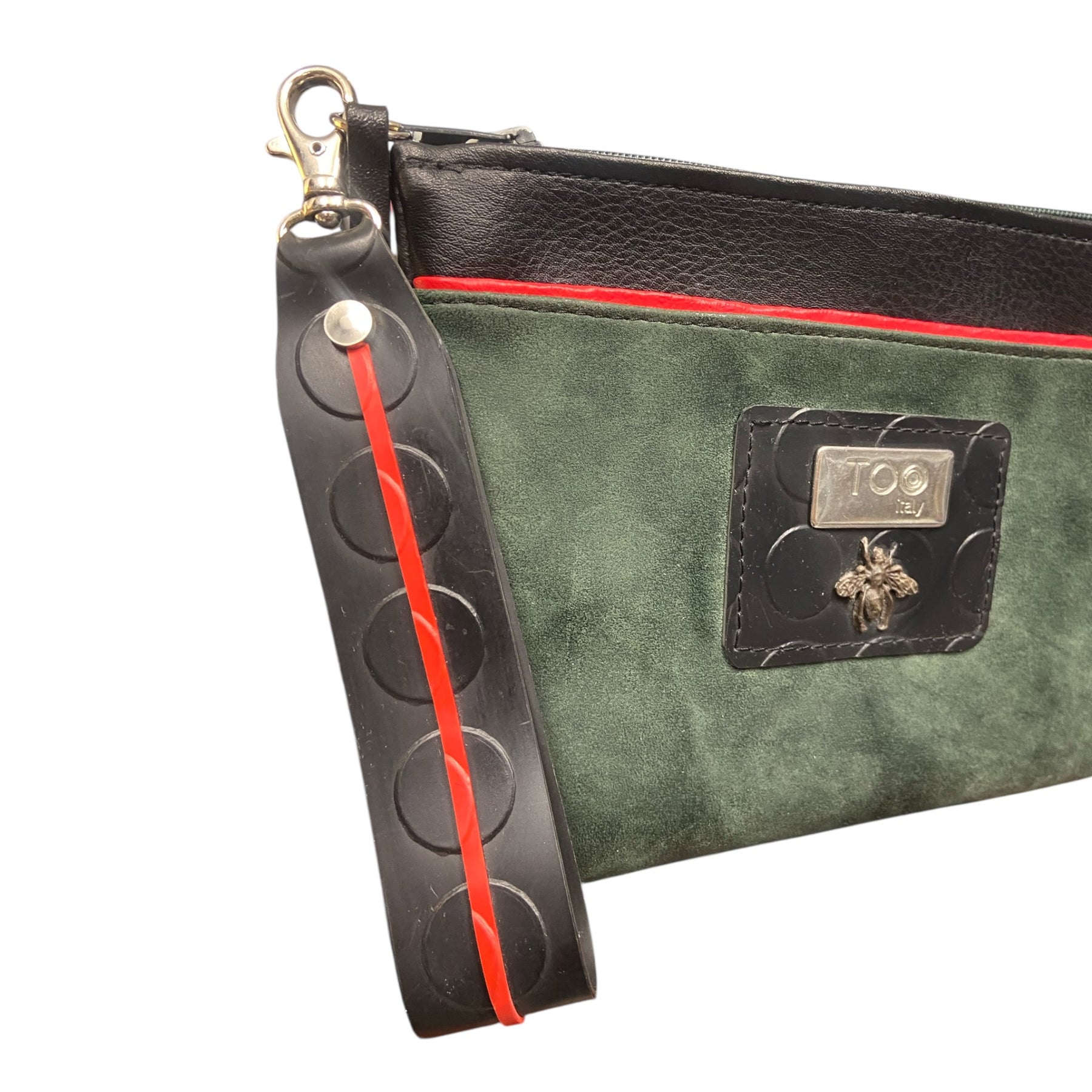 Realizzata in Alcantara e pelle artificiale, è rifinita con un elegante bordino rosso che ne sottolinea il profilo e aggiunge un dettaglio cromatico deciso. Sul fronte, il rettangolo in PVC ospita l’etichetta in metallo TOOitaly e l’ape in resina.