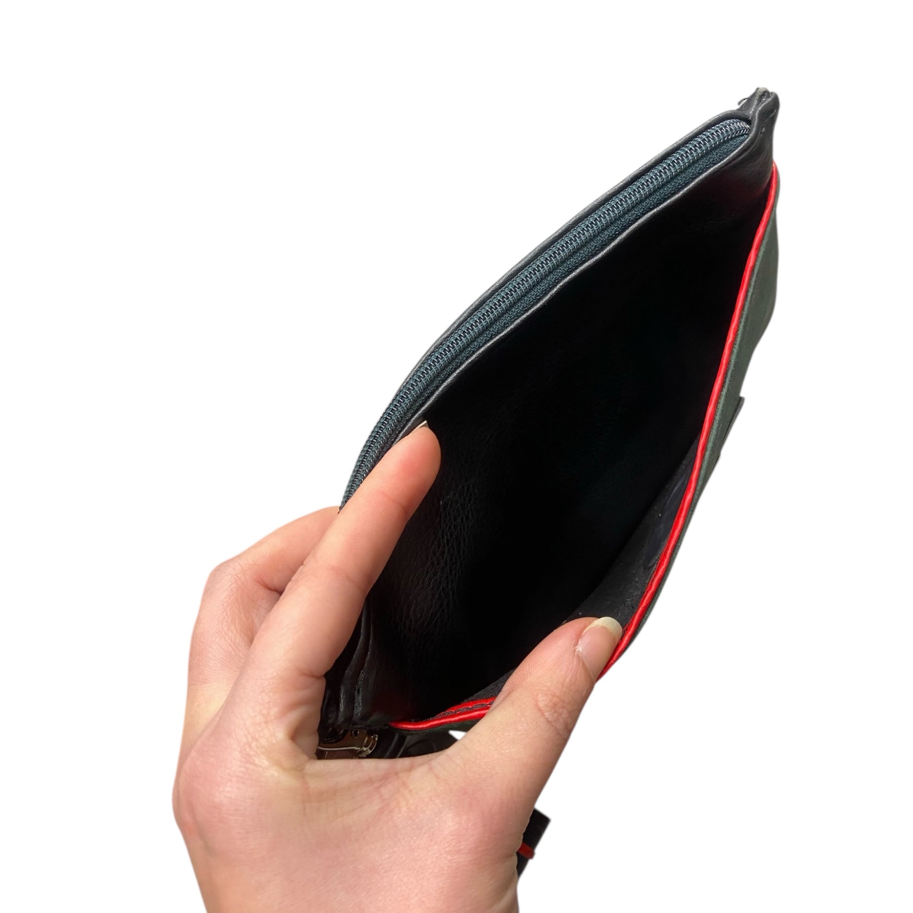La chiusura con cerniera superiore garantisce sicurezza e comodità, mentre la polsiera permette di portarla facilmente a mano, rendendola perfetta sia come mini bag indipendente sia come organizer da inserire all’interno di borse più grandi.